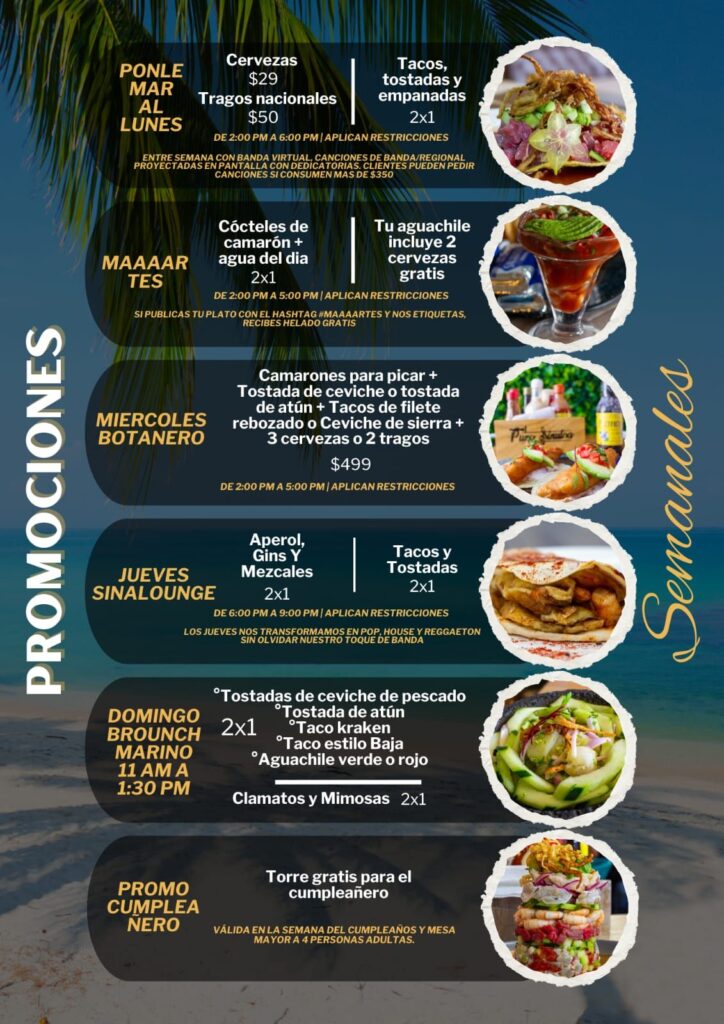 Pero espérate, que la cosa se pone mejor con las bebidas bien originales: Negroni, Bull, Martini de cebada y el clásico “Muchacho alegre”, mientras el ambiente se prende con música sinaloense en vivo, ¡sin cover y con promos de locura toda la semana!