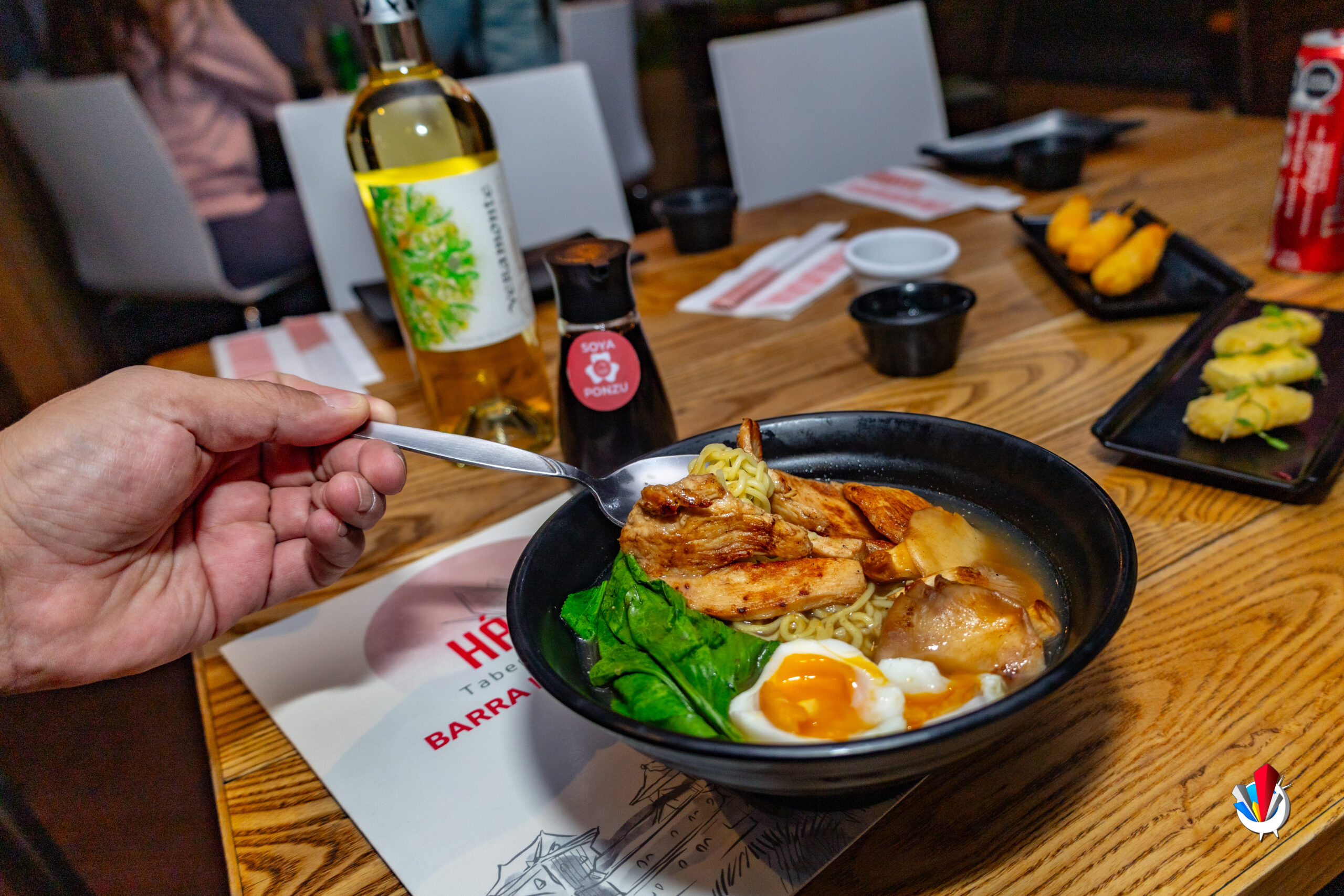 - El ramen de pollo Sopa tradicional con pollo, fondo de la casa y fideo fresco acompañado de setas y bok choy que está buenísimo para las tardes frescas.